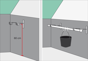 Usaremos una barra de cortina de 1 mt con soportes, 2 ganchos “doble s” y baldes concreteros. Fijar la barra de cortina con sus soportes a 60cm de altura. Colgar los ganchos y los baldes que servirán para guardar juguetes livianos.