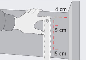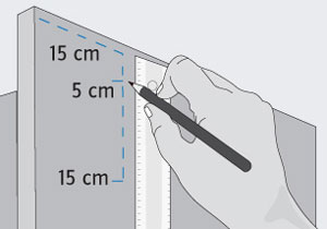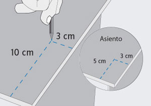 Con azul marcar en las 2 patas, los agujeros para los pernos, que van a 15 cm hacia dentro y a 5 cm y 15 desde el borde superior de la pata.