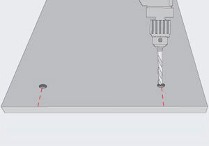 Con broca de 10 mm hacer todas las perforaciones marcadas con rojo, que será donde irán los tambores de la fijación. Esta pèrforación hay que hacerla sólo 15 mm hacia dentro de la madera.