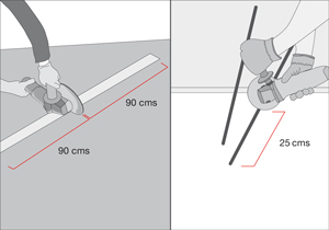 Con el esmeril angular y el disco de corte para metales cortar 2 trozos de pletina de 90 cms de largo y 4 trozos del fierro redondo de 25 cms de largo.