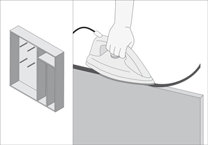 Parar el ropero y ubicarlo en su posición defintiva. Tapar los cantos con los rollos de enchape encolados. Cortarlos a la medida de los cantos y pasar la plancha caliente, el adhesivo se pegará con el calor. Pasar una lima para botar los excesos que quedan en los bordes. Este trabajo se tiene que hacer en todos los cantos visibles del ropero y en los 4 cantos de las repisas y zapatero (11 cortes de 35 x 27 cms).