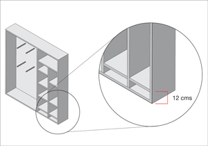 Los zapatos se pondrán en forma paralela al muro para que no entorpezcan el paso de la puerta. Cada espacio del zapatero tendrá 12 cms de altura, medida que hay que tomar para poner los soportes de las repisas.