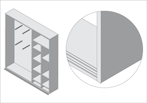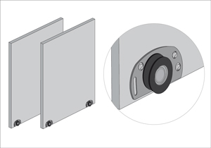 En el borde inferior del vano del ropero fijar con tornillos 2 rieles a una distancia de 4 cms cada uno. Hacer calzar las ruedas de las puertas en el riel, y en borde superior entrar la puerta con el carro guía montado, así es la única manera de atornillarlo al vano.