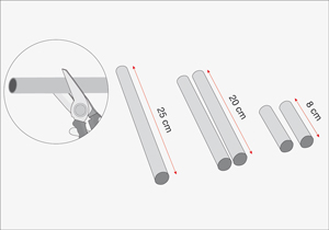 Cortar el tubo de PVC, para eso se usa una tijera especial para este material. Se necesitan 1 trozo de 25 cm, 2 de 20 cm y 2 más de 8 cm.
