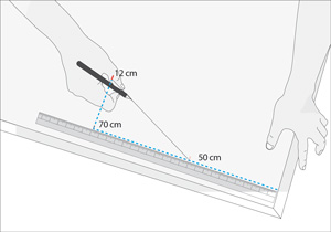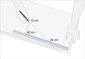 Poner estas 3 piezas en forma horizontal (2 cortes de 1,90x30 y 1 de 1,50x30) y marcar a lo largo 20 cm y 40 cm desde cada extremo. En este punto, y con la ayuda de una escuadra, medir 12 cm hacia arriba y trazar una diagonal hasta los 20 cm que se marcaron al comienzo. Después las 2 diagonales se unen con una línea recta.