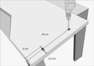 Las perforaciones para las patas van a 2,5 cm desde cada extremo, contando 6 y 20 cm desde abajo