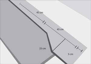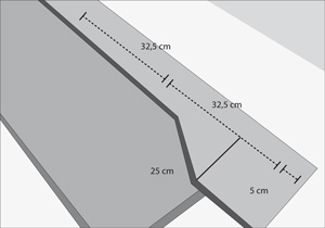 Poner esta pieza (1 trozo de 2,10x1,05) y marcar a lo largo 50 y 70 cm desde cada extremo. En este punto, y con la ayuda de una escuadra, medir 12 cm hacia arriba y trazar una diagonal hasta los 50 cm que se marcaron al comienzo. Después las 2 diagonales se unen con una línea recta.