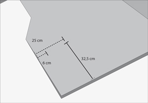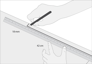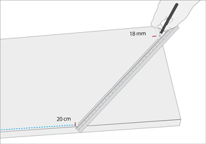 Poner estas piezas (2 cortes de 42x27 cm) en forma horizontal y hacer un marca a 18 mm desde la esquina superior derecha hacia abajo. Después en el borde inferior izquierdo medir 20 cm a lo largo, trazar una diagonal uniendo los 2 puntos marcados.