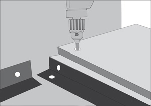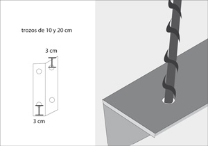 Los ángulos también tienen que tener perforaciones que coincidan con las que se hicieron en la madera. En los trozos de 20 y 10 cm van 4 perforaciones, cada una a 3 cm desde los extremos. Estos agujeros los hacemos con broca para metales de 8 mm.