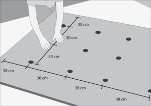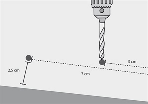 Las perforaciones para las patas van a 32,5 cm desde cada extremo, contando 6 y 20 cm desde abajo. Las perforaciones para el colchón van a 25 cm desde el borde inferior, pero con una distancia de 40 cm en los extremos, y las otras 3 a 32,5 cm entre sí. Hacer los agujeros con el taladro y broca para madera de 8 mm.