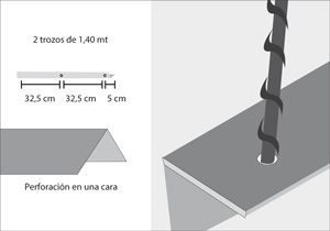 En los 2 trozos de 1,40 mt van 5 agujeros sólo en 1 de sus caras, a 5 cm de los extremos y el resto a 32,5 cm de distancia entre sí. Estos agujeros los hacemos con broca para metales de 8 mm.