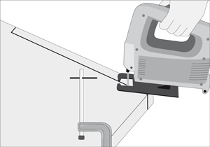 Prensar de a uno los trozos de madera en el mesón, para cortar con la sierra caladora la forma de las patas, y la diagonal de los veladores, siguiendo la figura marcada en los puntos anteriores.