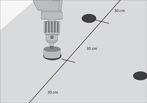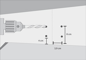 Las perforaciones para el colchón van a 25 cm desde el borde inferior, pero con una distancia de 40 cm en los extremos, y las otras 3 a 32,5 cm entre sí. Hacer los agujeros con el taladro y broca para madera de 8 mm.