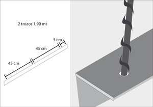 En los 2 trozos de 1,90 mt van 5 agujeros sólo en 1 de sus caras, a 5 cm de los extremos y el resto a 45 cm de distancia entre sí. Estos agujeros los hacemos con broca para metales de 8 mm.