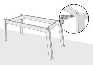 El armado se hace con las tablas de canto, usando con cola fría y 2 tornillos de 3” por cada unión. Primero hay que marcar en las patas la posición de los tornillos que unirán con los horizontales más largos (130,3 cm). Los tonillos van a eje a 1 cm del borde y dejando una distancia de 10 cm con el segundo. Avellanar la madera, poner cola fría y atornillar. Las patas con los horizontales largo se unen con los 2 horizontales cortos, que se fijan de la misma manera, pero moviendo la distancia de los tornillos para que no choquen.