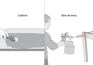 Proteger la cubierta con sellador de madera a la piroxilina aplicado con brocha, que además de tener un secado muy rápido y endurecerse más que la pintura al agua, no alterará el color natural del roble. La base de la mesa se pinta con esmalte aplicado con compresor y pistola. Se eligió el color “rows of roses” de Kolor tendiente al “marsala”, declarado por la empresa de identificación de colores Pantone, como el color 2015.