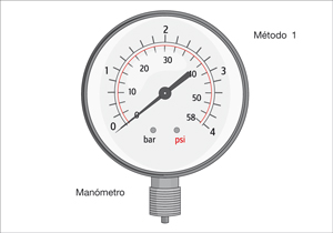 - Método 1: Si se tiene un medidor de presión (manómetro), conectarlo a la llave y abrirla completamente.