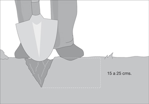 - Con una pala o picota excavar las zanjas. Abrirlas en forma de “V”, de 15 a 25 cm de profundidad.