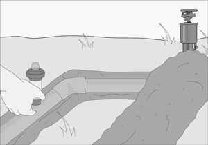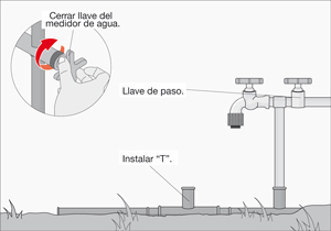 - Para conectarse a una llave exterior, cerrar la llave en el medidor de agua y cortar la cañería principal en un sitio conveniente.