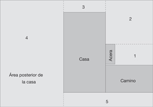 - Dibujar primero el terreno y el perímetro de la casa. Luego marcar todos los árboles, arbustos, flores, áreas de pasto, zonas de circulación, entradas de auto, terrazas, etc. que existan o se vaya a instalar en el jardín. Marcar también la ubicación del medidor de agua potable.
