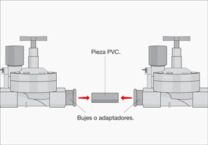 - Los bujes, o adaptadores, permiten ajustar el diámetro de la válvula al tubo de PVC. Para asegurar una buena conexión y evitar filtraciones de agua, poner cinta de resina antiadherente sobre el hilo de la unión y luego apretar.