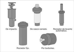- Rociadores: para áreas pequeñas a medianas con césped o arbustos. Se ajustan para regar 1/4 de círculo, 1/2 círculo, 3/4 círculo o círculo completo y pueden regar franjas angostas, ya sea instalados al final o al centro de la franja. Su radio de tiro es también ajustable. Pueden ser de 2 tipos: