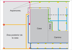- Marcar en el plano la posición de los aspersores. Cada tipo de aspersor tiene una distancia de tiro específica, generalmente ajustable, que viene indicada en su envase. Ésta determina el distanciamiento máximo al cual se debe instalar.