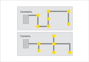 - Diseñar los circuitos teniendo una línea principal, de la cual se vayan derivando las conexiones a los distintos aspersores (en forma de T). No diseñar una sola línea continua que cambie de posición a medida que avanza, pues mientras más directo sea el trazado de las cañerías, menores serán las pérdidas de presión del agua.