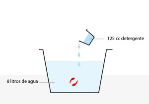En el balde que trae la aspiradora hacer la mezcla de detergente usando 125 cc por 8 litros de agua.